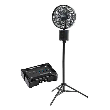 Includes the KickAss 212W Anderson to USB Fast Charger for quick multi-device charging and a large oscillating fan with remote, tripod and power banks for cooling and extra phone power.