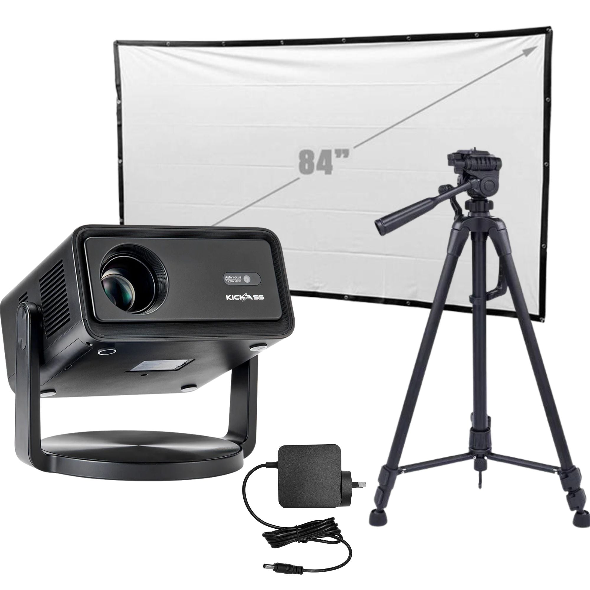 KickAss 12V FHD Outdoor Cinema Smart Projector Bundle with AC to DC Adapter, Tripod and 84" Eyelet Screen Cinema Package