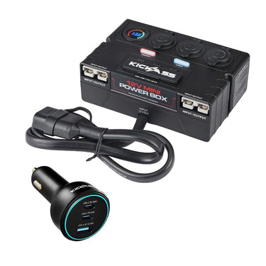 Includes: KickAss 12V Mini Control Box (6 USB, 3 cig sockets, 2 Anderson connectors, LED voltmeter) and KickAss 100W USB C/A Car Charger (3 ports, 12V and 24V compatible).