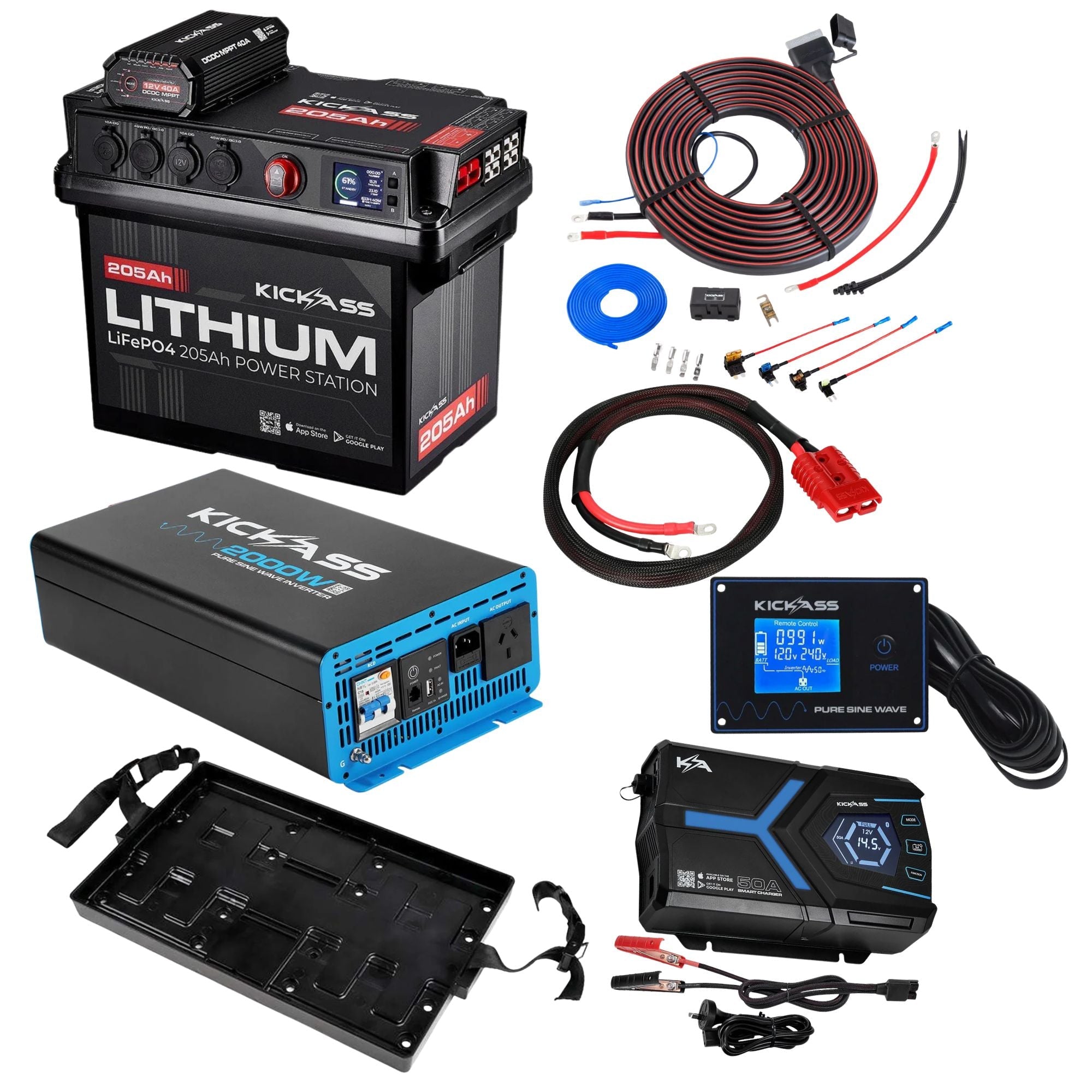KickAss 205Ah Lithium Battery Box Complete Dual Battery Kit with 2000W Inverter, AC Charger & Wiring