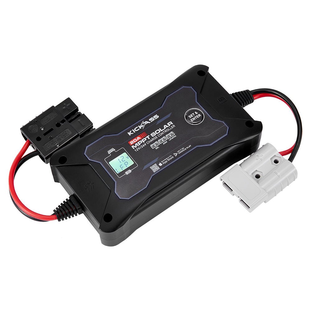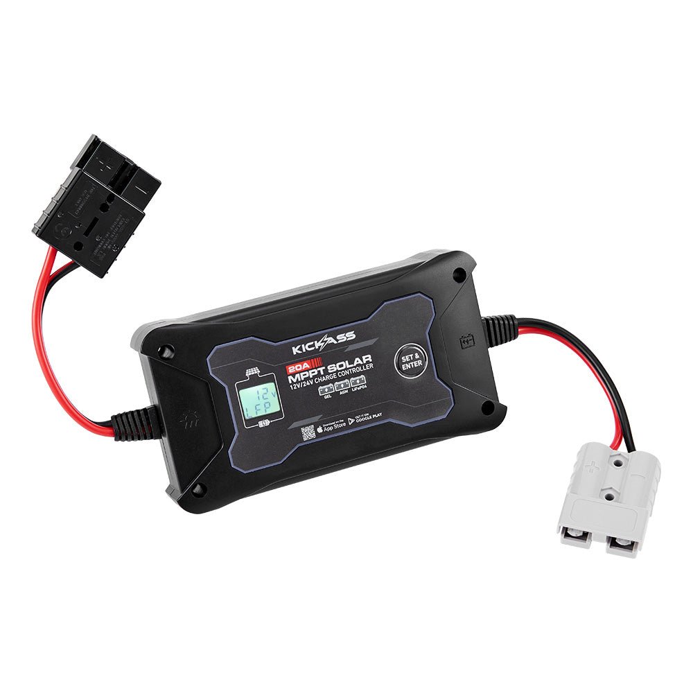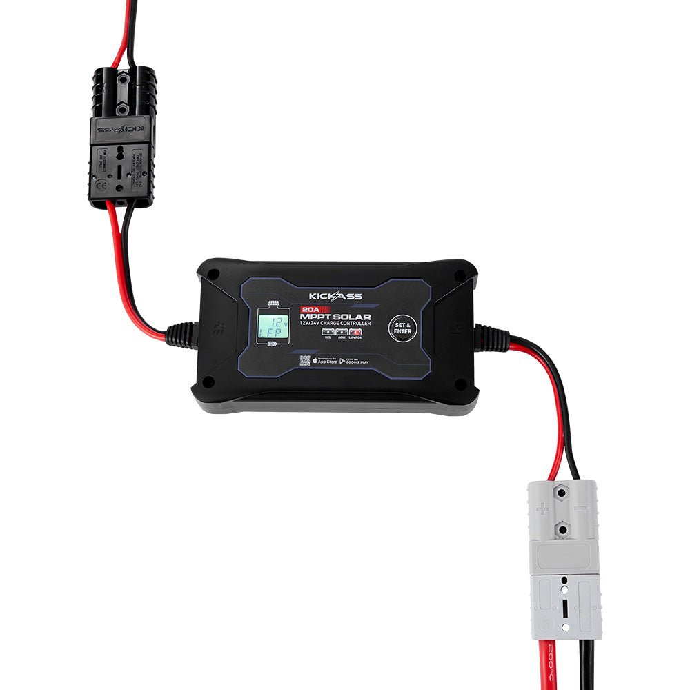 Harness the full power of your solar setup with the KickAss 20A 12V/24V MPPT In-Line Solar Charge Controller. Designed to be efficient and easy to use, it delivers smart, high-speed charging with plug-and-play simplicity, Bluetooth monitoring, and full Lithium compatibility – perfect for pairing with solar blankets and portable solar panels.