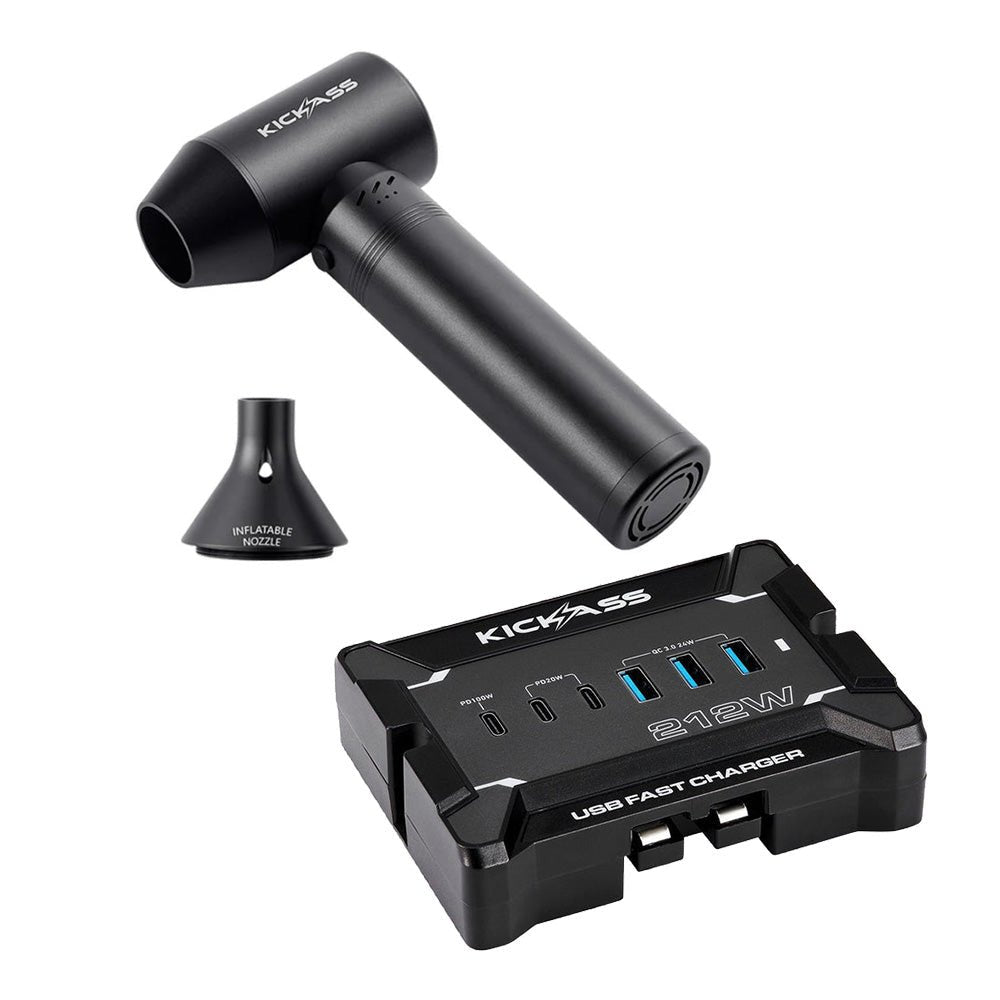 Includes KickAss Jet Blower Fan Max for powerful cordless cleaning and inflating plus the 212W Anderson to USB Fast Charger for fast off-grid device charging.