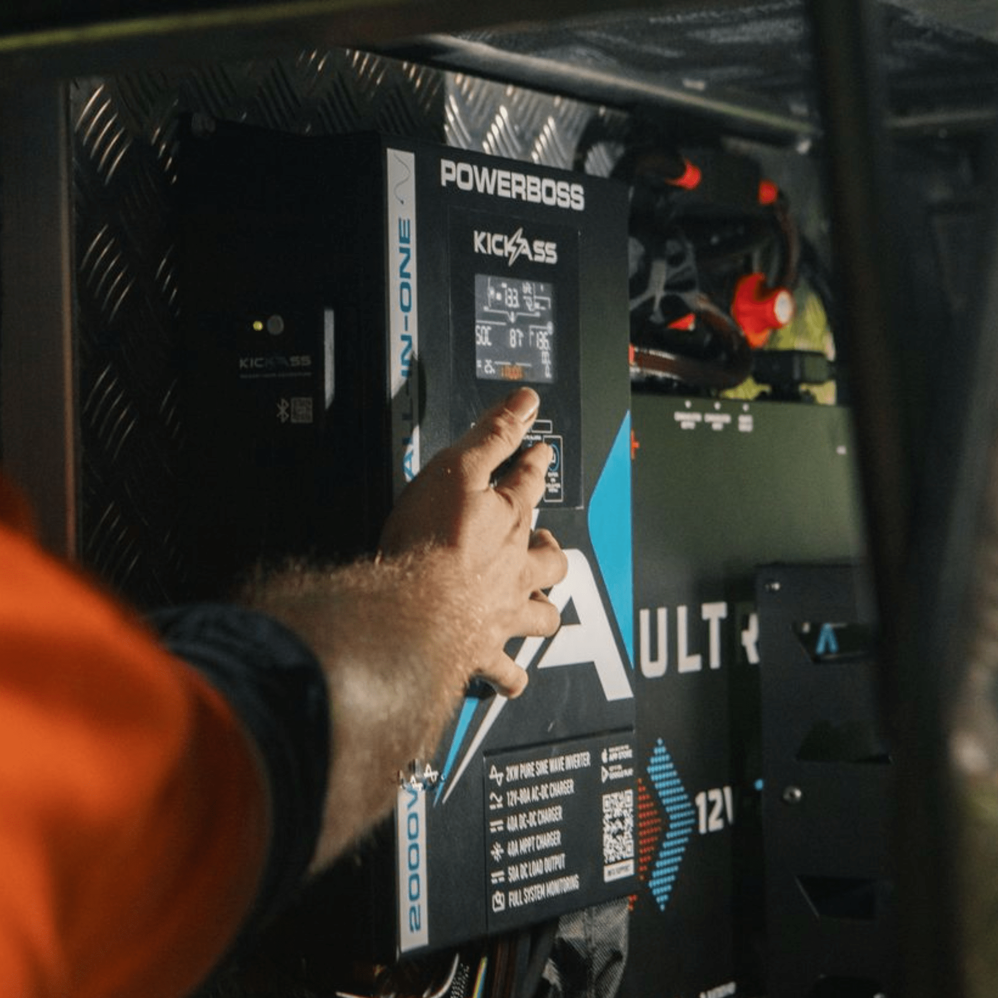 Take your off-grid power setup to the next level with this KickAss PowerBoss Bundle. It includes the flagship PowerBoss unit featuring a 2000W inverter, 80A ACDC charger, 40A DCDC MPPT charger, and Bluetooth monitoring. The bundle also comes with the Remote LCD Display Unit for convenient system monitoring, plus the complete plug-and-play installation kit with premium 0AWG cable, isolator, 300A fuse, and all essential tools. Ideal for canopies, 4WDs, campervans, and trailers, this bundle simplifies installation and ensures reliable off-grid power.