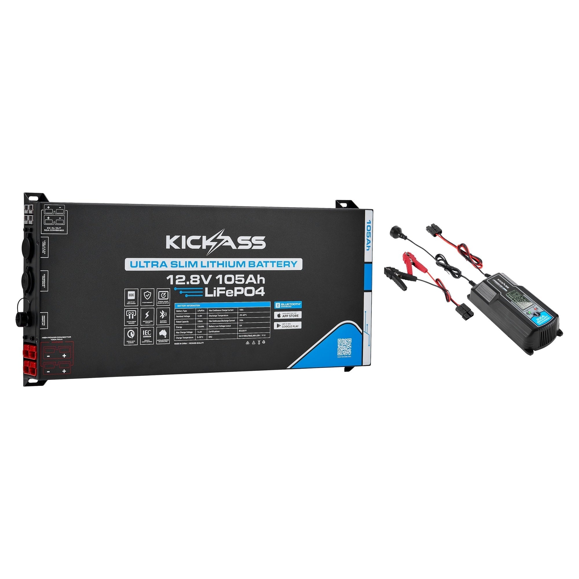KickAss Smart 12V 105Ah Ultra Slimline Lithium Battery + 22A Smart Battery Charger Bundle